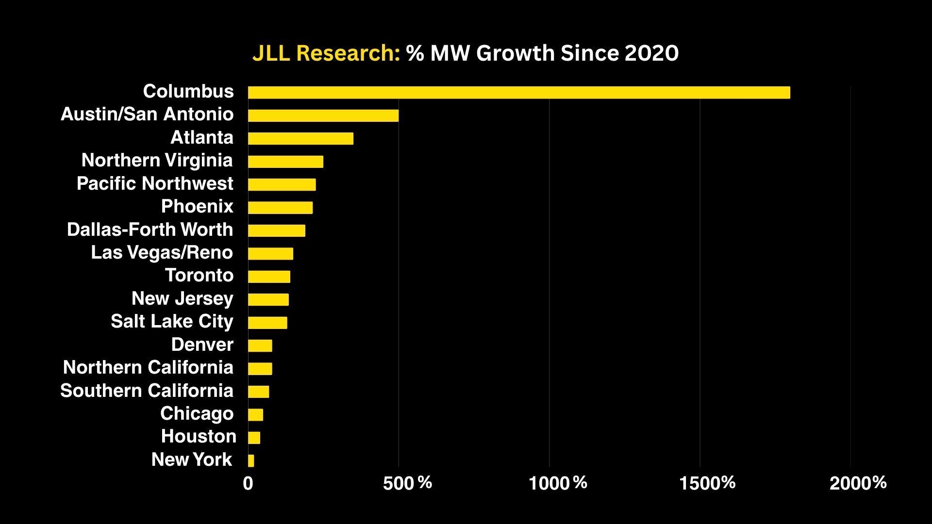 📊 JLL Data: Columbus (+1,800%), Austin/San Antonio (+500%), and Atlanta (+350%) have led in growth since 2020.